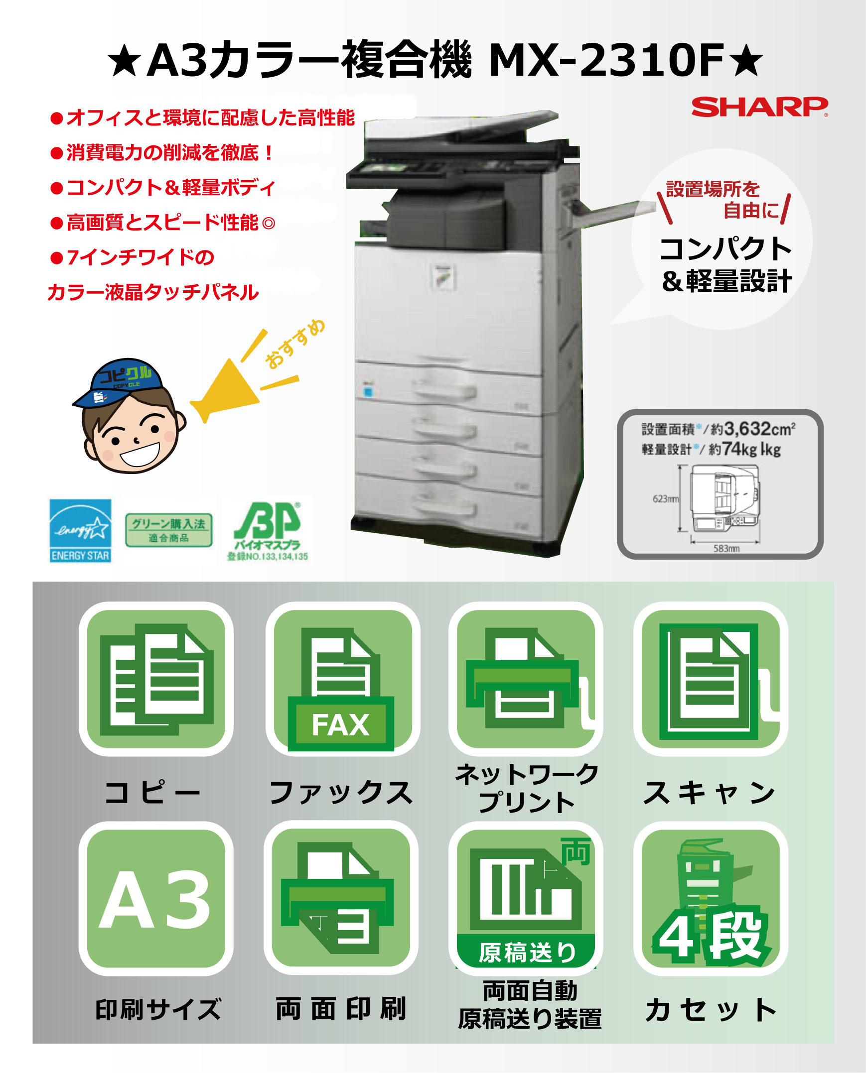 ■購入商品 SHARPシャープ MX-2310F ■購入のきっかけ 以前よりお世話になっており、いつも迅速にご対応いただける ので買い替え検討の際にお電話させて頂きました。 続きを読む